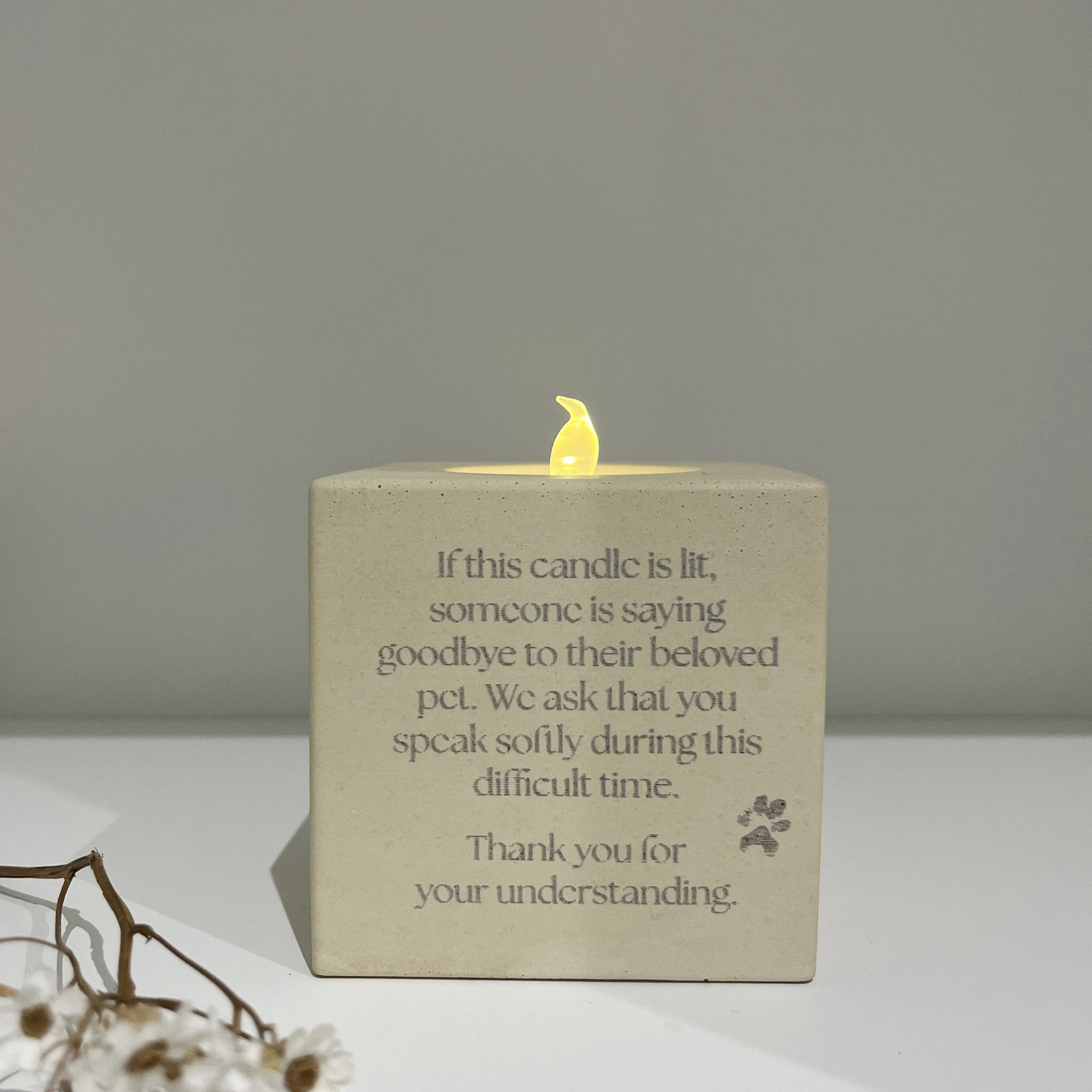 Each candle holder is hand made from Jesmonite, an eco-friendly sustainable composite material. Etched with the text ' If this candle is lit, someone is saying goodbye to their beloved pet. We ask that you speak softly during this difficult time. Thank you for your understanding' Each candle holder is unique, and may have a slight colour variation to the picture. There may be some natural air bubbles from the casting process.