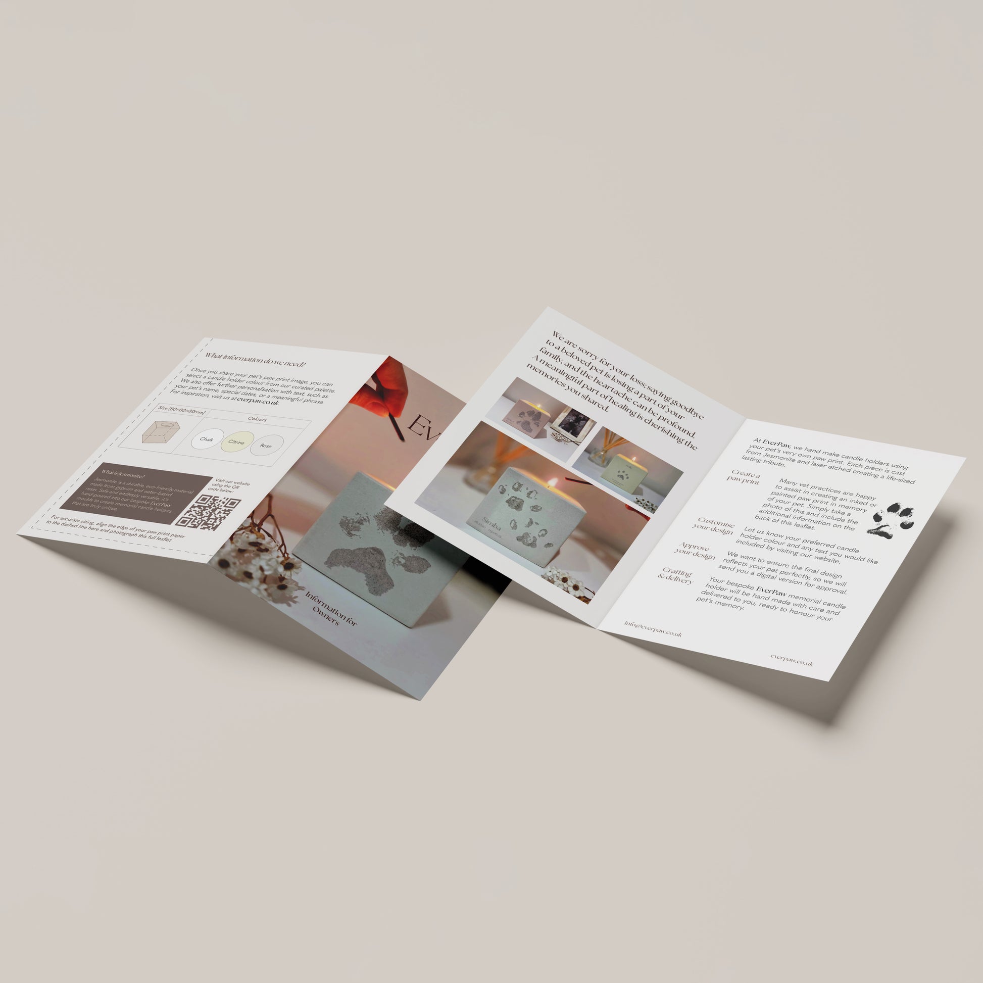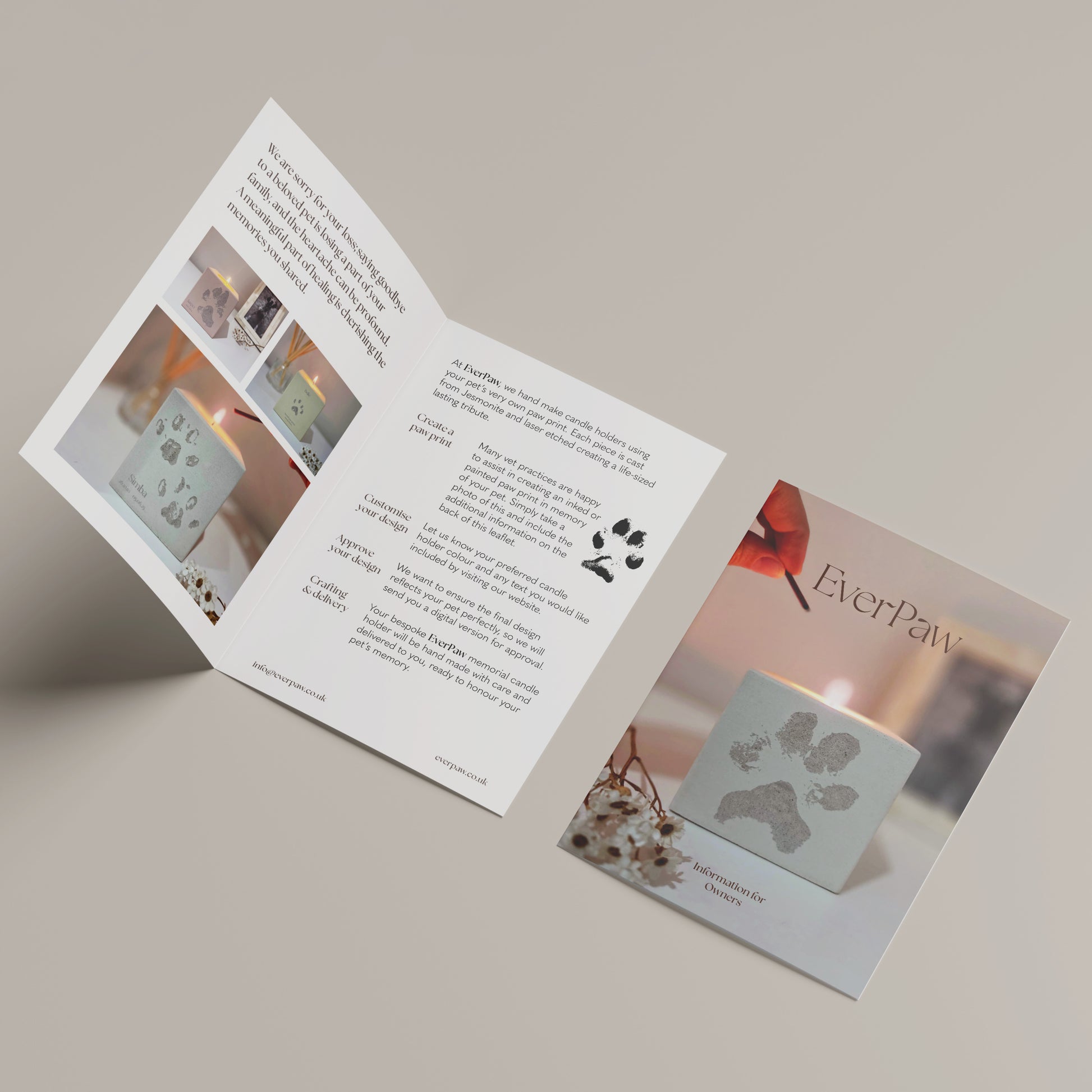 Our client leaflets provide all the information required for your clients to chose and order their own unique candle holder. Designed for gifting alongside the paw print your veterinary practice have kindly created during euthanasia.